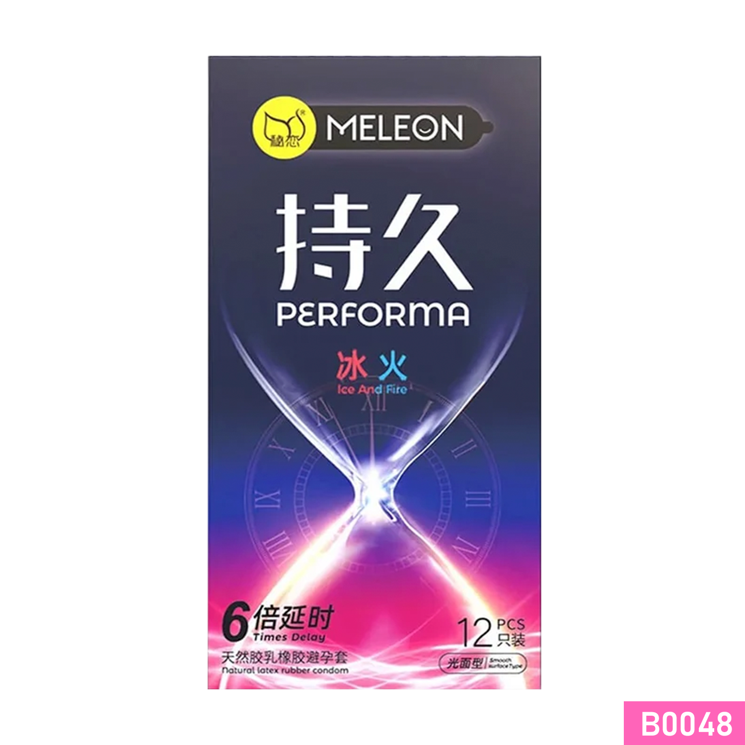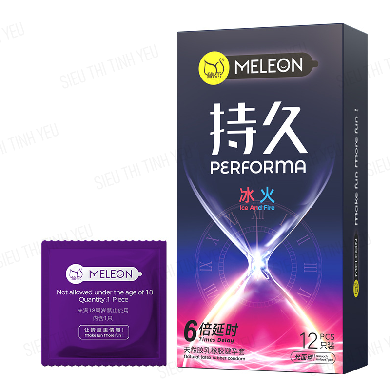 Thông tin: Bao cao su Meleon Performa Ice and Fire - sản phẩm chứa thành phần kéo dài thời gian quan hệ, giúp nam giới kéo dài thời gian yêu đến tối đa 6 lần so với bình thường. Sản phẩm này tuyên bố về độ phong độ của phái mạnh. Đặc biệt hơn, bao cao su mang lại cảm giác lửa băng, chuyển đổi giữa ấm nóng và mát lạnh để đem lại khoái cảm tuyệt vời trong tình dục.