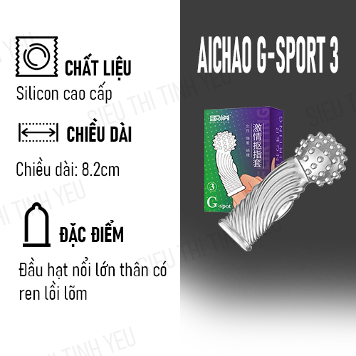 Bao cao su ngón tay Aichao G-Spot 3 với thiết kế đầu to kèm hạt nổi lớn để tăng sự kích thích điểm G, đặc biệt dọc thân có ren lồi lõm nhằm cọ sát "cô bé" hơn, giúp tăng khoái cảm cho nàng ngay trong lần dạo đầu. Sản phẩm được làm từ chất liệu silicon mềm mại, an toàn và dễ dàng vệ sinh sau khi sử dụng xong.