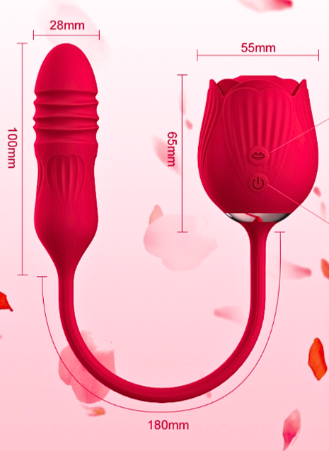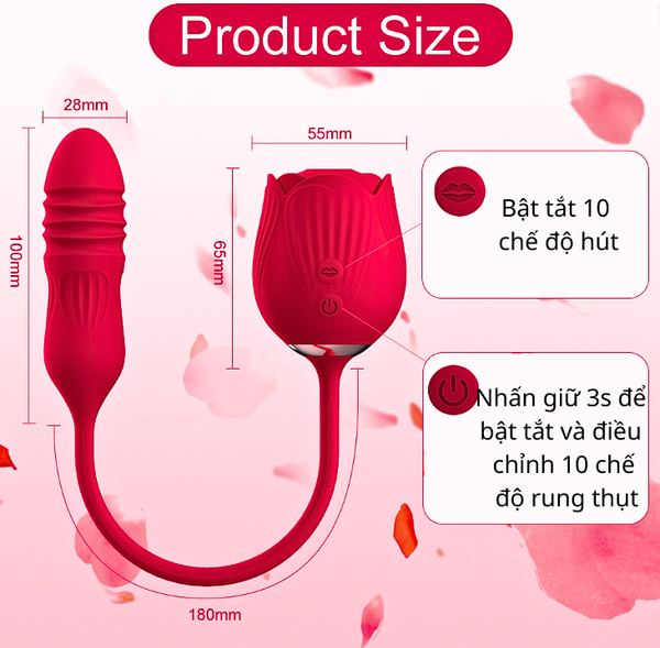 - Kích thước: Với 1 đầu rung nhỏ gọn, 1 đầu hút hình hoa hồng màu đỏ rực rỡ chiều dài khoảng 65 mm cho đầu hút và 100mm cho đầu rung, nàng có thể chọn lựa sự tiếp xúc nhẹ nhàng hay lấn sâu vào bên trong, cọ sát những điểm G đầy hưng phấn và cho nàng nhiều cảm xúc khó tả.